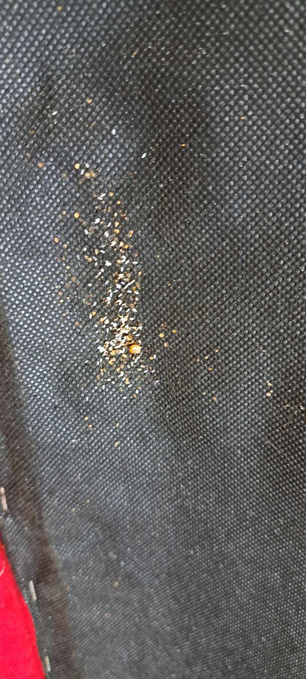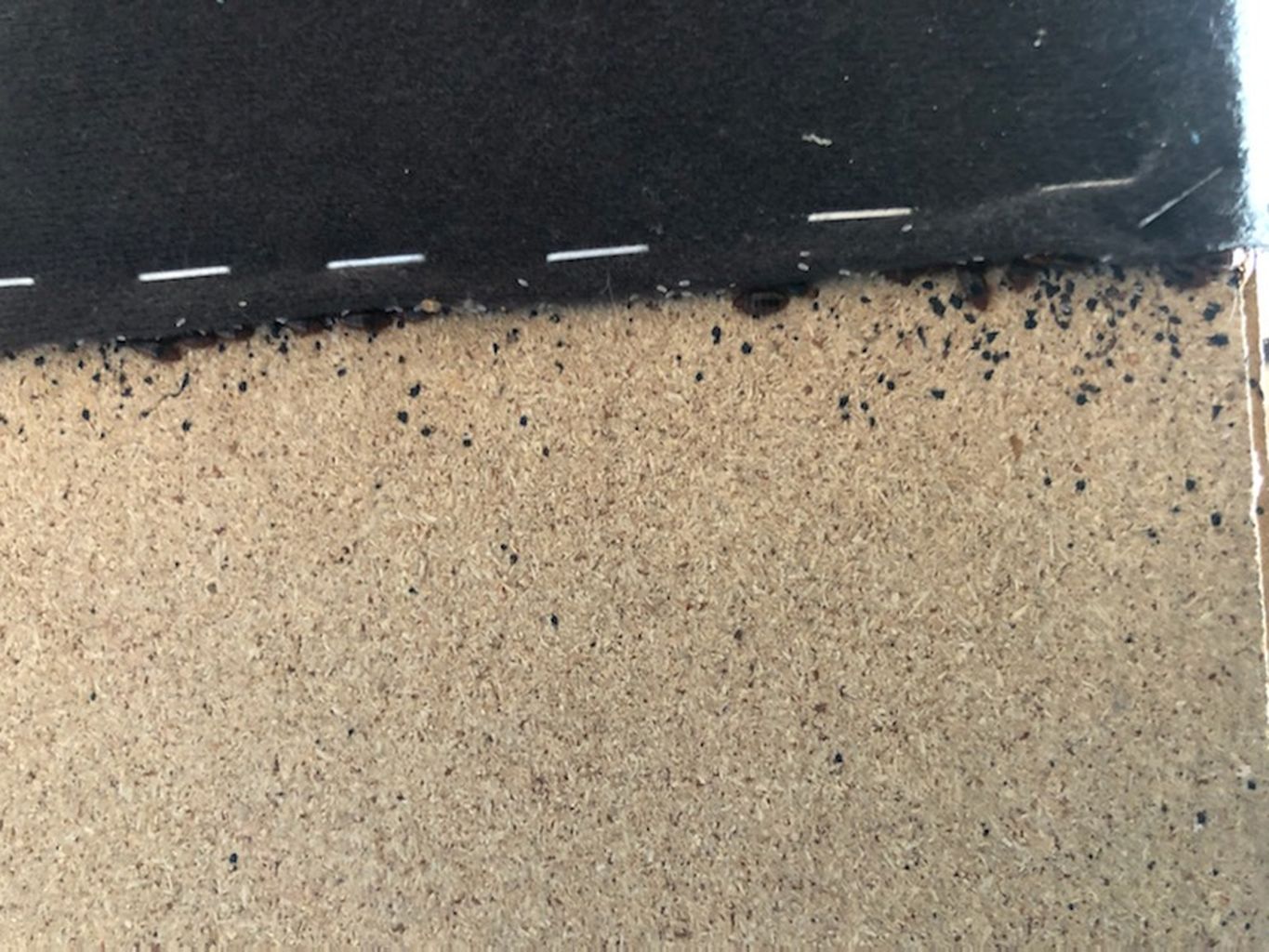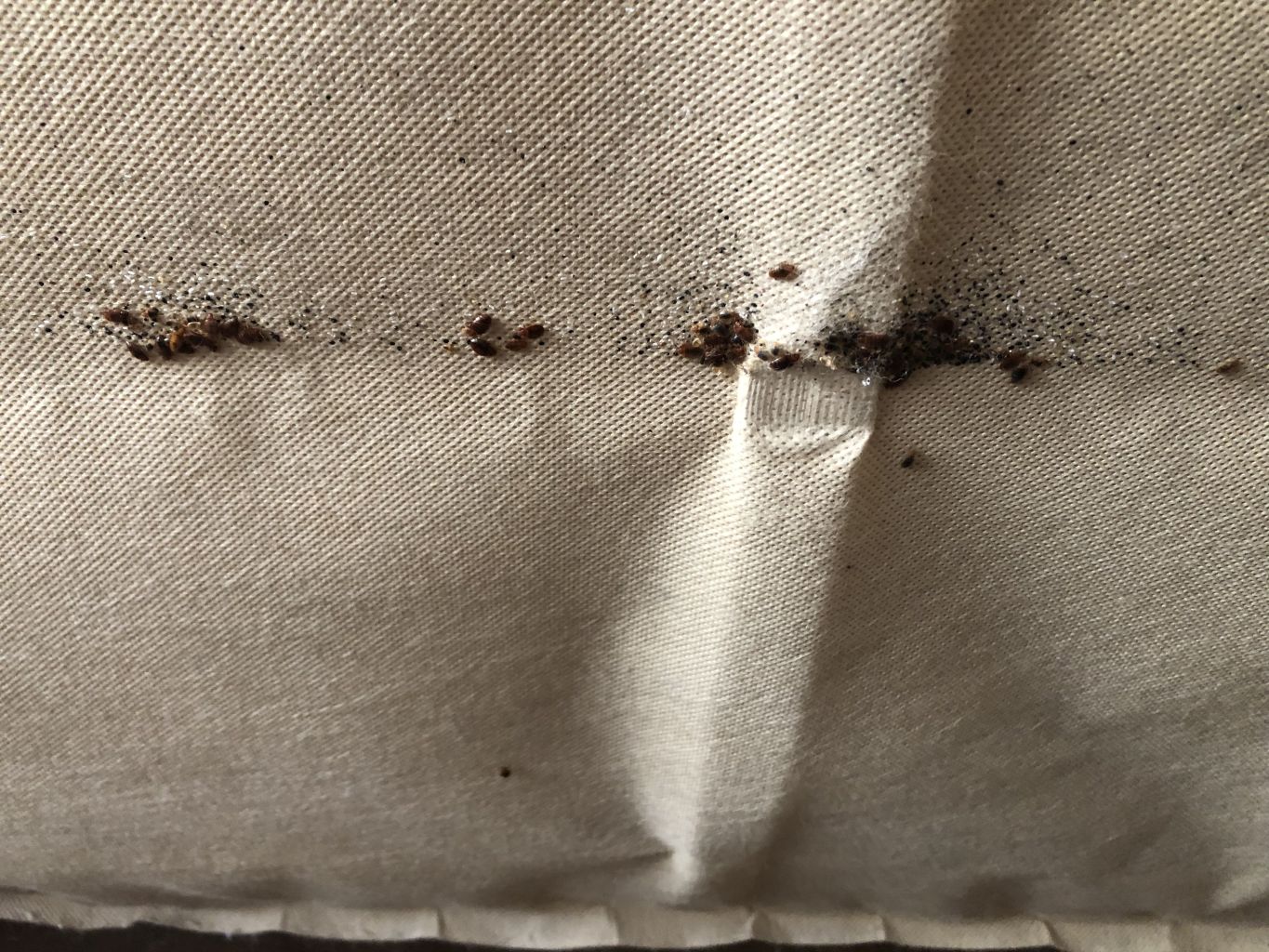 Odchody: Czarne lub ciemnobrązowe plamki (odchody pluskiew) na pościeli, materacach, ramach łóżka, meblach i w szczelinach.
